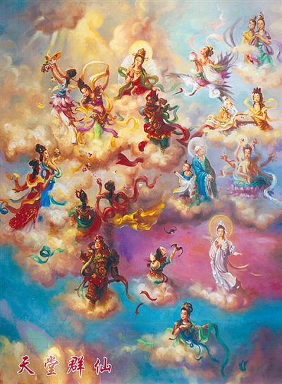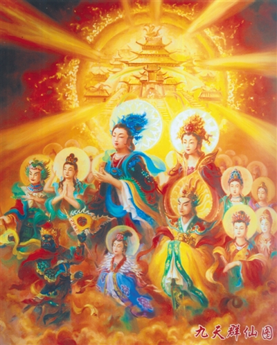 玉皇万寿圣诞,万仙来庆贺,福气盈天地。人们来朝拜,沾光启宏运。