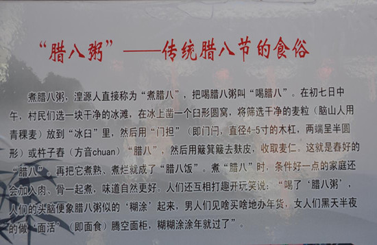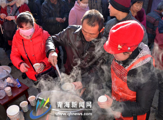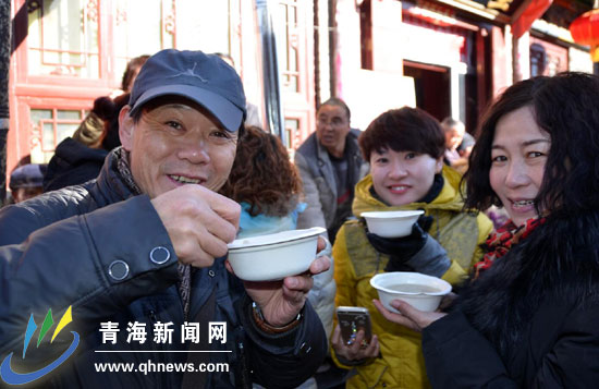 据介绍,湟源的腊八粥是将青稞去皮与牛羊肉同煮,加青盐、花椒、草果和茴香等佐料,经文火熬制而成,因而有商家特意将熬腊八粥用的青稞放入木桶,邀请游客舂青稞参与腊八粥的制作。