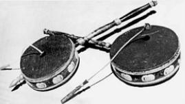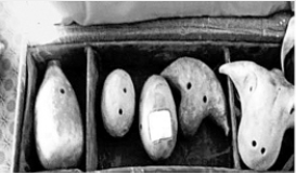 图为:箫仿造的埙及牛头埙(左一); 六弦琴(扎木念) 青海京胡(右一); 晌盒 河湟铜口弦(左二);龙鼓 青海藏区的长柄鼓(右二)