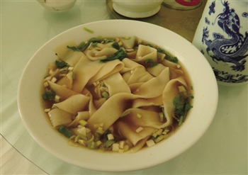 无论是面片或拉面,从锅里盛出后调以炸酱或稍子、卤汤等佐料,入口柔软光滑,筋而不断。做面片和拉条,关键是和面与揉面,调面时掺盐和碱,成团后反复揉,直到面的筋性出来,压成扁平的面基子,再用布盖着捂一会儿,即可揪可拉了。面片煮熟从锅中捞起,用肉丝、青菜等在油锅里再炒,叫炒面片。加入青菜在肉汤里烩制,是烩面片。在农村或牧区,一般习惯在宰羊煮肉之后,先吃肉,然后往肉汤锅里揪面片,叫羊肉面片。据说,面片的来历正是由于明洪武年间开始的移民发配充军有关,发配充军就是将人犯押解到边远地区从事强迫性的屯种或充实军伍,是轻于死刑、重于流刑的一种刑罚,作为死刑代用刑“刑莫惨于此”。据资料记载,充军劳役监分布所在,最远四千里,最近一千里。分发地区南北方向有一定限制,青海自古以来就被认为是蛮荒之地,发配充军也成为一种刑法的处罚。被押解到青海的那些人犯们都戴着枷锁,不容许带刀具。他们在行走途中的吃饭时把面揉好,做成面基子,放一会儿,然后拔一些野菜,用手拧开下到锅里,将面基子揪成面片,做成简单的饭食。
