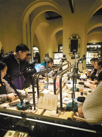 制作一份自己喜欢的手捧鲜花,调配一份喜爱的香氛,灌注在项链吊坠里封存,串一份像电影《你的名字》里那样的组纽系扣,赋予你和你所热爱生活的羁绊;尝试活字印刷,感受下我国古代四大发明之一的神奇乐趣;在工作台用小锤敲敲打打,将一张简单的牛皮重新赋予生命,成为一个自己创作,全球独家的牛皮手工包……记者注意到,几何书店与其他复合书店不同的经营理念,以前的书店,可能在放着生活类书籍的旁边,摆上了很多生活类工具。而几何书店里更多的是穿插了一种现场体验,比如唐卡的制作,书店不仅做到了与市民近距离接触,而且大众还可以亲自制作,画师打好唐卡的底稿后,有兴趣的读者可以上色。此外,多彩精致的酥油花,藏香、藏族的木刻版画,大众都可尝试亲手制作。而书店表示:“对于这些古老的技艺,大家可以体验,可以学习,而不只是把它们当成博物馆里不可触碰的陈列物。”从皮具制作工艺、陶泥拉胚、金工制作、黏土手工,调香精油,串珠组纽,店内还有很多可以手工DIY尝试的机会,每个项目都让手工爱好者非常想要尝试。“除了看书、买书之外,还可以约上三两好友来这里做手工,我来过好多次,趁着节假日休息和朋友来这里体验手工制作,也很有意义,这里的工作人员会指导我们如何制作。”正在做皮手环的曹女士告诉记者。