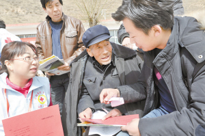 青海省红十字会为了将结对共建帮村、结对认亲帮户的“双帮”工作落到实处,该会全体干部分别到民和回族土族自治县古鄯镇菜子湾村扶贫点与30户贫困群众一对一结对认亲帮扶、建卡,分赴各户仔细倾听、认真记录村民心声、需求和意见,立足本村本户实际开展扶志、扶智、扶贫工作,使贫困群众早日摆脱贫困。图为3月27日红十字会干部扎西在向何进辉仔细了解家庭情况,并填写干部结亲扶贫卡。杨展望 摄