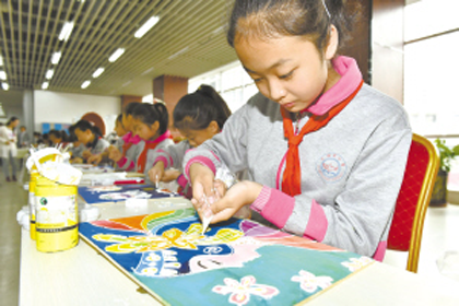 5月26日,西宁市城西区古城台小学在城西文化艺术中心举办“墨彩飞扬润泽童心”美术书法摄影作品展,来自全校各个年级的小作者们带着精选出的五百多幅书法、手工制作、创意画等优秀作品进行了集中展示、讲解及现场创作,提前度过了一个别样的“六一”国际儿童节。图为六年级的同学现场创作沥粉画作品。黄灵燕 摄