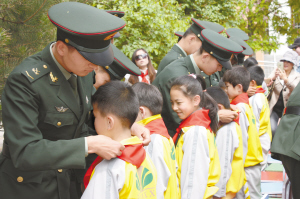 解放军叔叔给170名小学生戴上了鲜艳的红领巾
