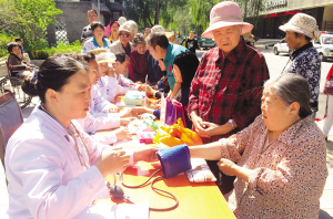 随着基层医疗卫生条件的改善和服务水平的提升,免费义诊已成为西宁市一些医院、卫生服务站的日常工作之一。图为西宁市城西区卫生服务站的医护人员联合兴海路街道办事处兴胜巷社区的工作人员走上接头为辖区的老年人开展免费义诊。祁国彪摄