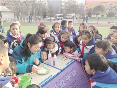 西宁市西关街小学的学生们正在体验青海省科技馆青少年科学工作室带来的有趣科学实验。