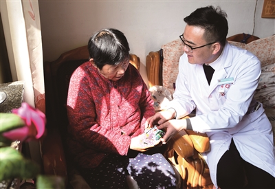 医师丘祥建将药品发放给行动不便的王爱珍老人手中。