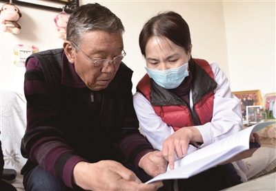 家庭医生服务团队人员为冯元宝老人讲解服务手册。