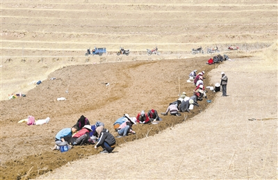 3月28日,大通回族土族自治县景阳镇后山村的村民们在地里采挖蕨麻。