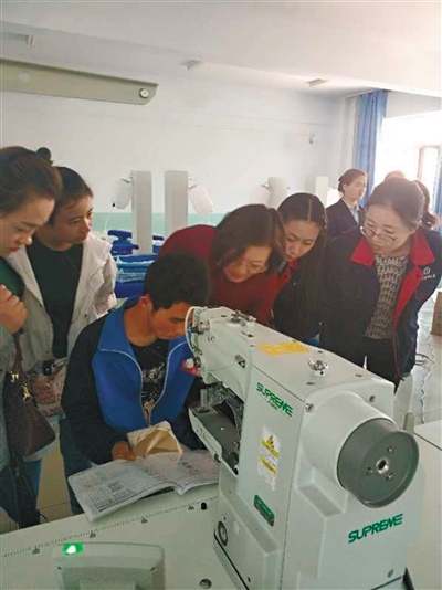 学生用一体化模板缝纫机绣花。李雪萌 摄