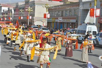 果洛藏族自治州玛沁县精彩纷呈的巡游表演。(王湘琳 杨秀太 摄)
