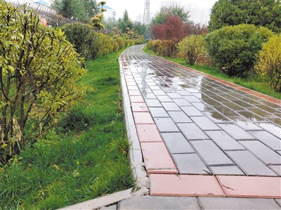 在景观园路上行走,尽管下着雨,可没有一处积水,鞋也不会被打湿。放学的学生蹦蹦跳跳地行走,也没有溅起水花,沿着连通小区与湟水河北岸人行道之间的园路回到了桥电小区。