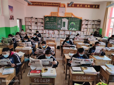 玉树州第四民族高级中学内,刚刚举行完抗震救灾十周年纪念活动的1700名学生,三五成群,在花坛边、在树荫下认真阅读着《西宁晚报》。