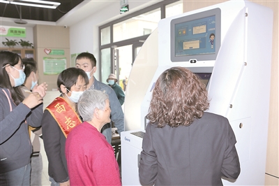 工作人员指导老人使用政务自助一体机。图片由北商业巷社区提供