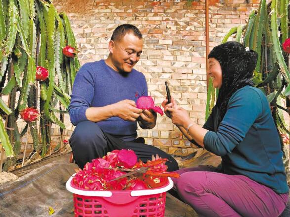 马文明和妻子拍起了火龙果的小视频,希望借助新媒体平台使得火龙果大火一番。