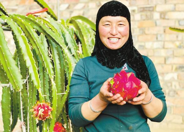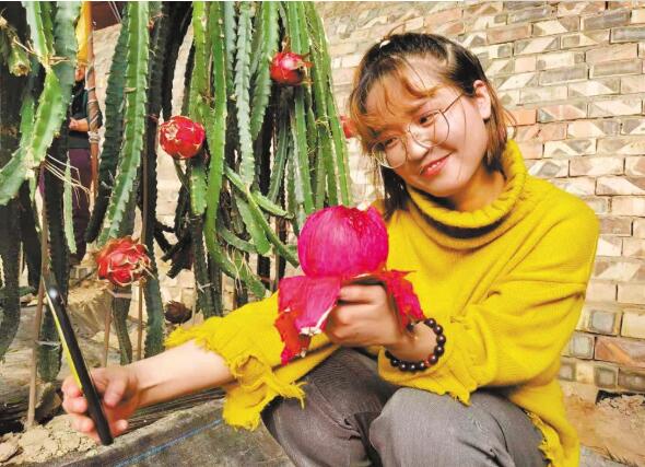 马文明说:“目前火龙果种植了10000多株,火龙果从5月下旬开始陆续开花、挂果,采摘一直可以持续到年底。”今年火龙果大约挂果7000公斤,纯利润有20万元。不仅如此,今年他带动周边1400多人来农场务工,带领他们一起走向小康。栾雨嘉 摄