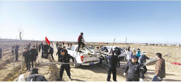 4月27日,海西蒙古族藏族自治州茫崖市组织开展以“共建美丽家园、共享绿水青山”为主题的全民义务植树活动,市直机关及各企事业单位干部职工300余人参加活动,共栽植苗木16700株,栽植面积6.67公顷。图为义务植树活动现场。王菲菲 萨仁娜摄