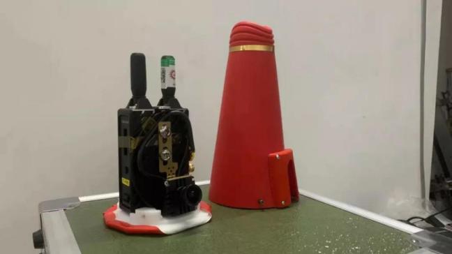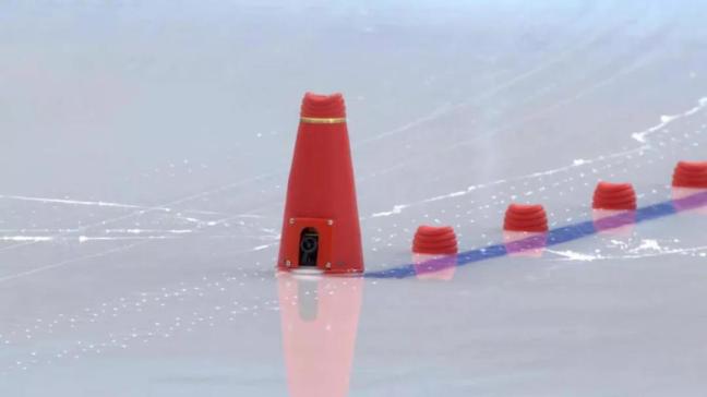 在国家速滑馆内,除了亮眼的“猎豹”外,冰面上还隐藏着另一种无线摄像机——冰面锥桶摄像机。它由摄像机、电池和无线发射装置三部分组成,被安放在用以标记赛道的红色锥桶中。冰面锥桶摄像机非常小巧,摄像机的体积甚至不到25立方厘米,就像一只在锥桶上打了个洞并从中探出头来的仓鼠。