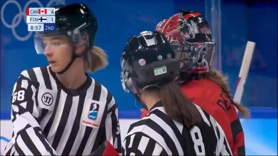 为了让观众更有带入感,很多参赛队员的身上也携带有无线摄像设备。例如,在2月5日女子冰球芬兰与加拿大的比赛中,上图中芬兰8号选手的头盔后部就有一个贴有绿色标签的无线电设备,这是一台无线摄像机,它们普遍使用7GHz频段专用频率,观众可以通过它身临其境地感受赛场上的争抢、碰撞。
