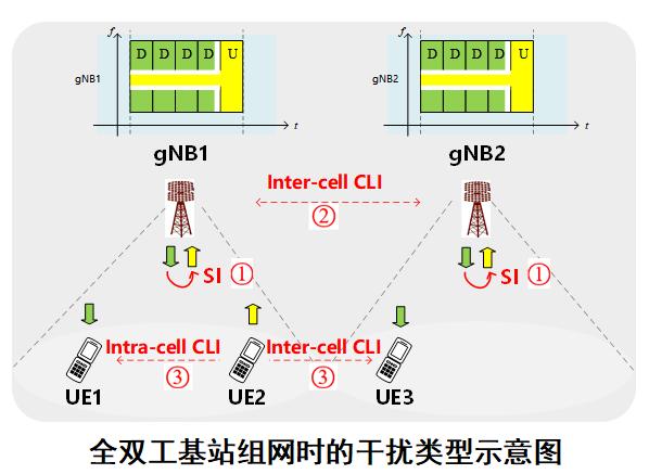 在进行全双工组网时,将面临复杂严峻的干扰挑战,包括:①基站同时收发的自干扰(基站A的下行信号发送干扰基站A的上行信号接收);②基站间的交叉链路干扰(基站A的下行信号发送干扰基站B的上行信号接收);③终端间的交叉链路干扰(终端A的上行信号发送干扰终端B的下行信号接收)。首先要解决的是基站自干扰,组网时需要额外解决基站间和终端间的交叉链路干扰。