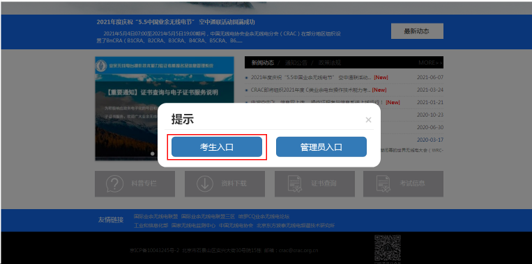 1、登录CRAC官网,在页面右下方选择【考试信息】,进入业余无线电台操作技术能力信息管理系统。