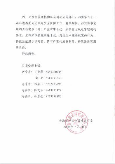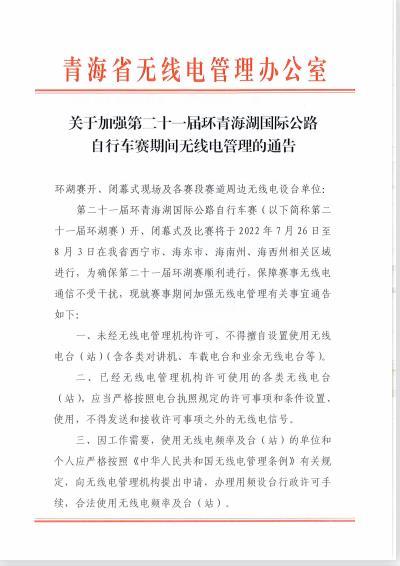 关于加强第二十一届环青海湖国际公路自行车赛期间无线电管理的通告
