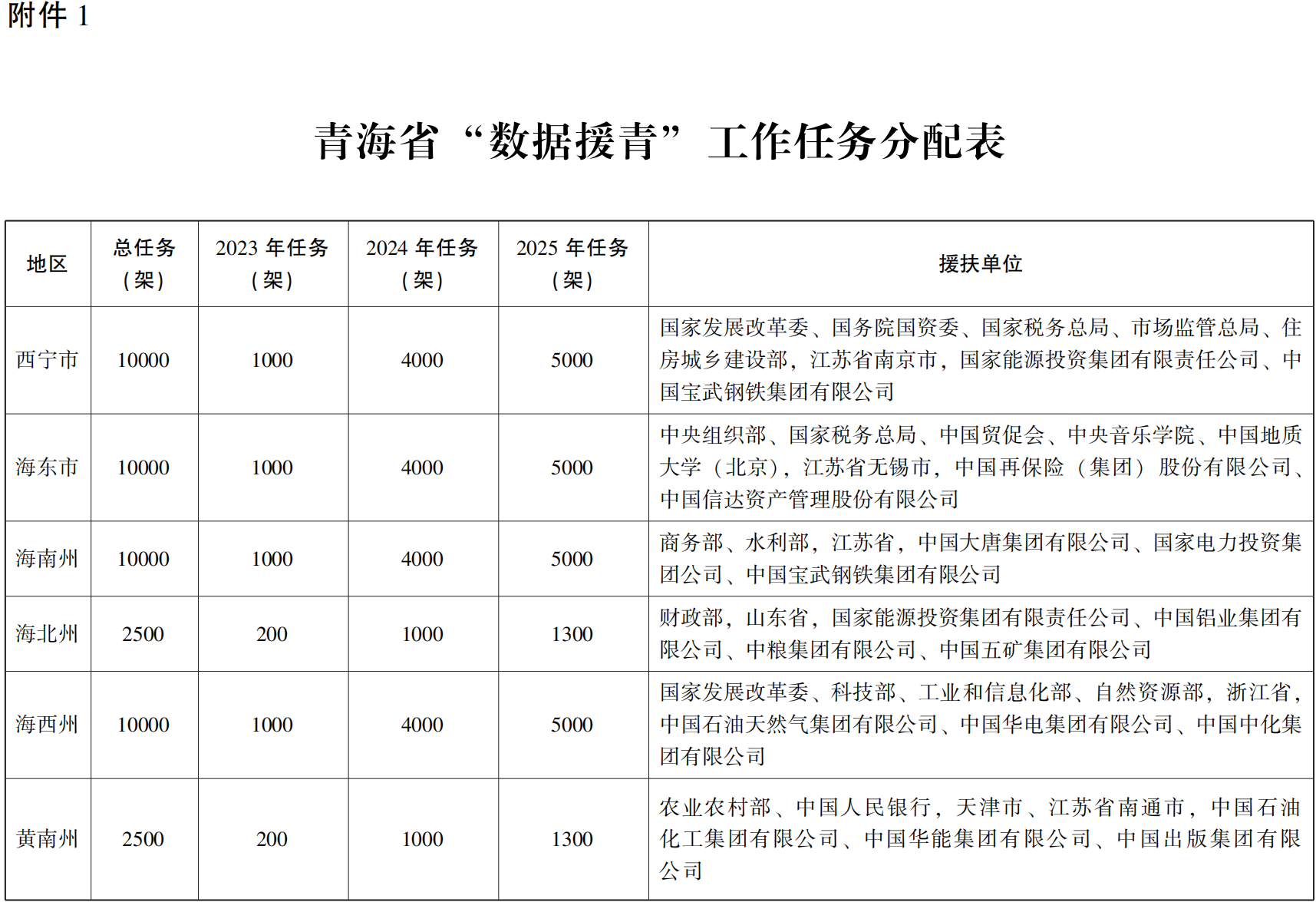 (一)汇聚一批数据资源。面向援扶单位及所在地区相关企业精准组织开展算力供需对接,争取一批政务数据、行业数据、企业数据等数据资源落户青海,形成一批“东数西算”“东数西储”典型示范应用场景。到2025年,“数据援青”引入算力规模达到1EFLOPS(每秒100亿亿次浮点运算),存力规模达到5EB(5艾字节),打造10个以上应用范围广、业态模式新、推广价值大的大数据融合应用平台和典型案例。(牵头单位:各市州政府;配合单位:省工业和信息化厅(省招商局)等省直有关部门)