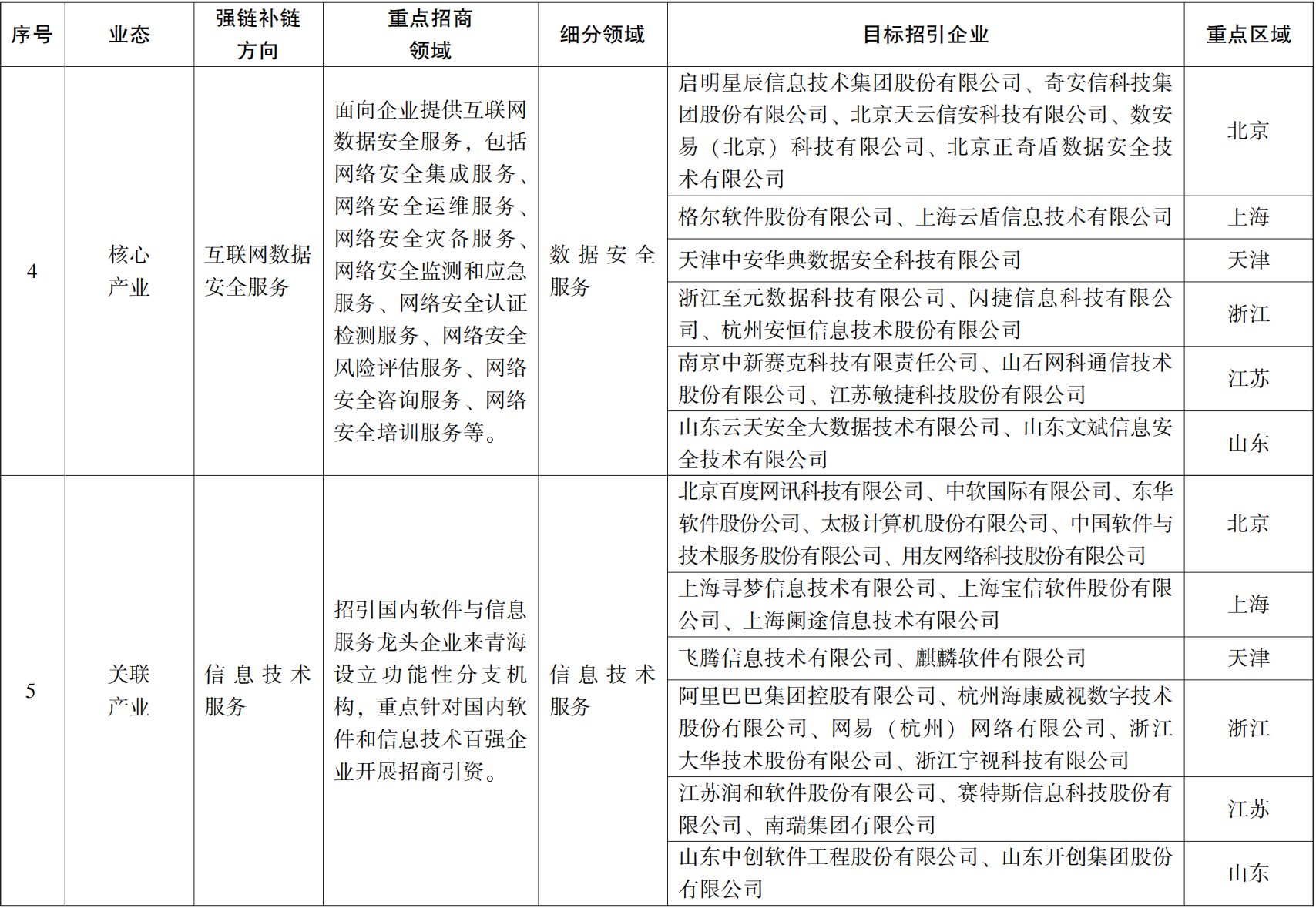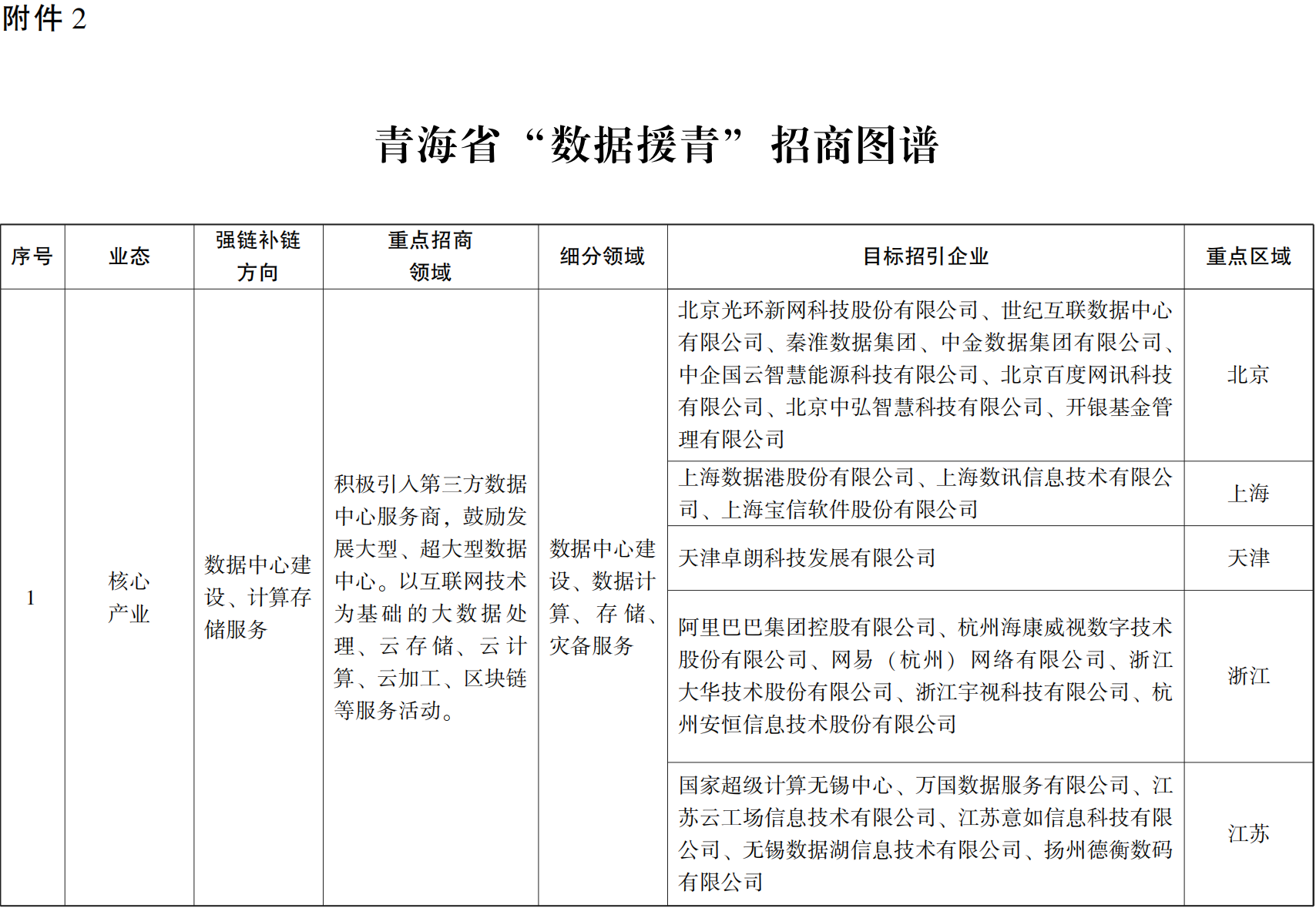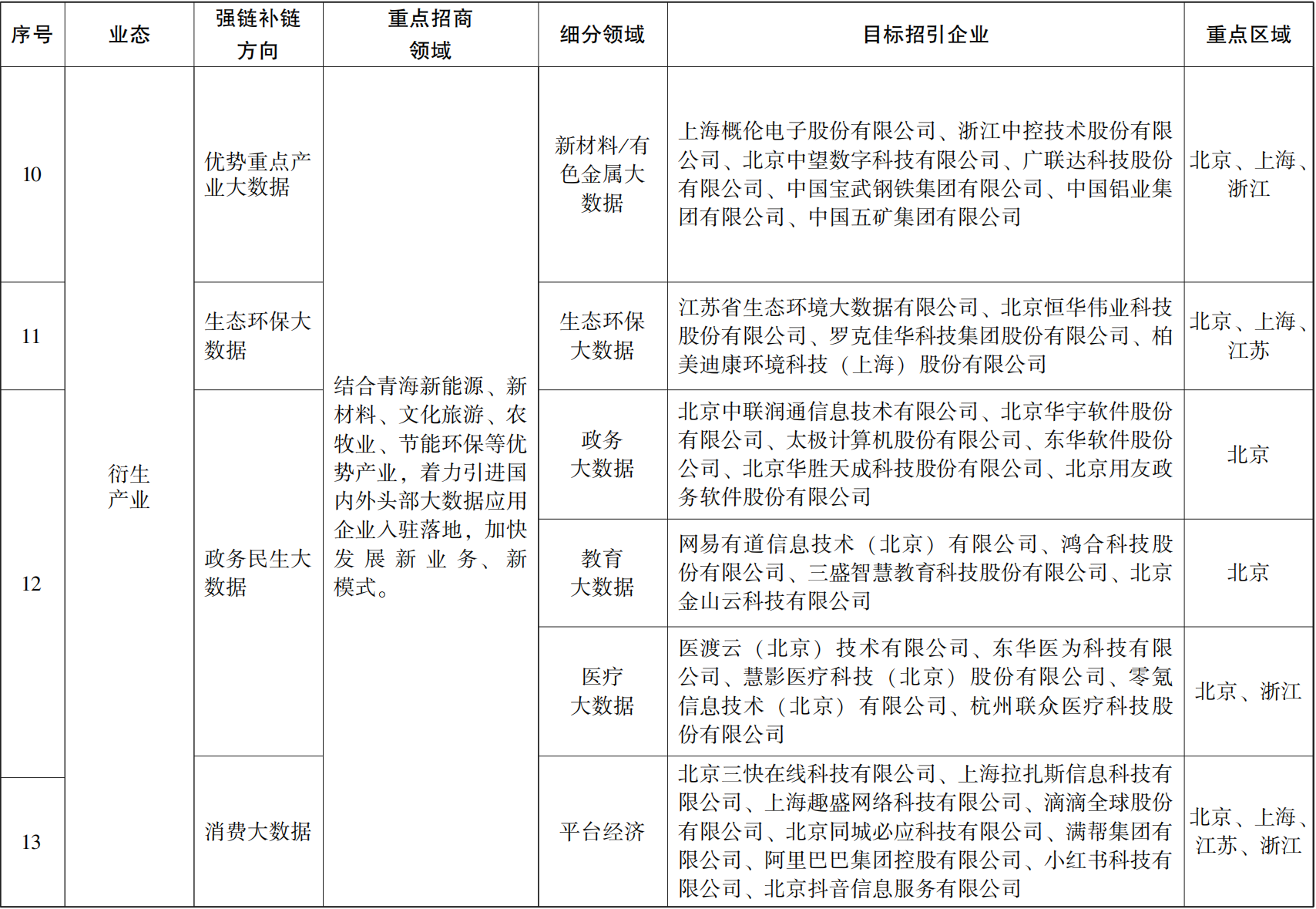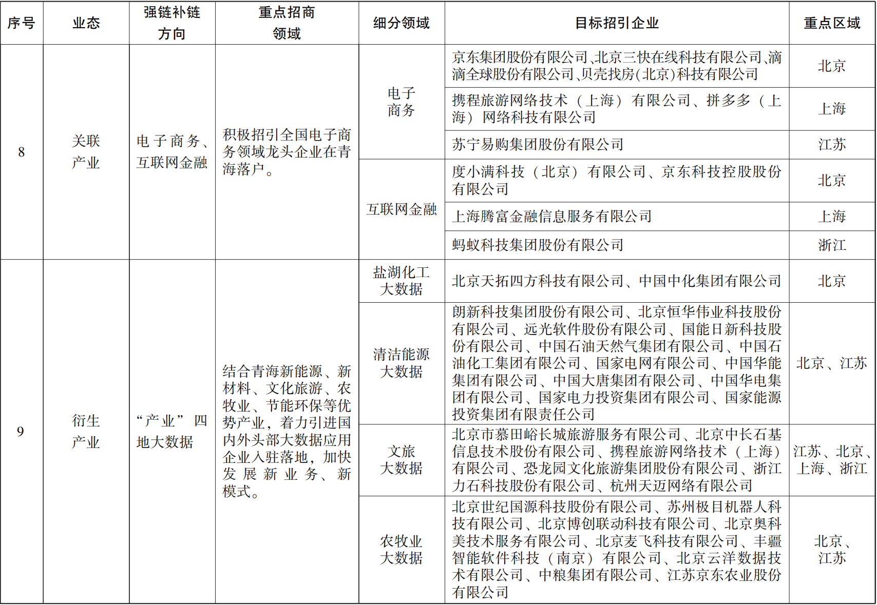 (三)招引一批头部企业。全力争取援扶单位支持,积极引进一批科技水平高、辐射带动强、产业特色突出的国内知名数据服务商、大型互联网企业在青投资布局区域性总部及数据基地,吸引带动上下游企业,延伸拓展产业链条,培育壮大产业集群。到2025年,“数据援青”引进大数据领域头部企业5户以上,带动培育上下游企业400户以上。(牵头单位:各市州政府;配合单位:省工业和信息化厅(省招商局)等省直有关部门)