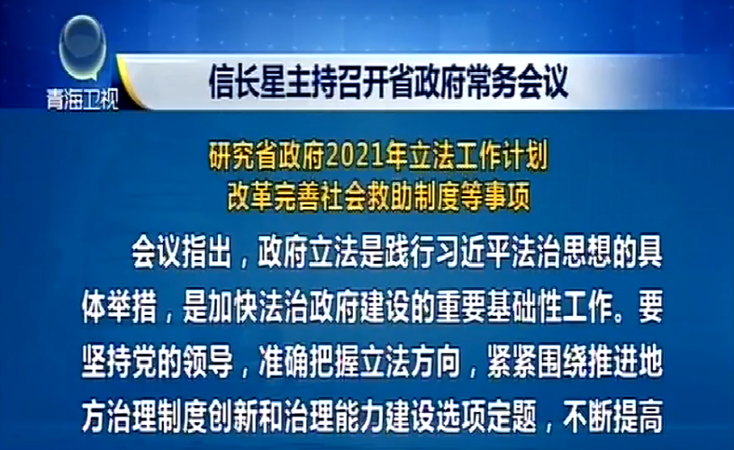 1月21日,省委副书记、省长信长星主持召开省政府常务会议,研究省政府2021年立法工作计划、改革完善社会救助制度等事项,审议并原则通过《青海省充实“米袋子”丰富“菜篮子”若干政策措施(送审稿)》。