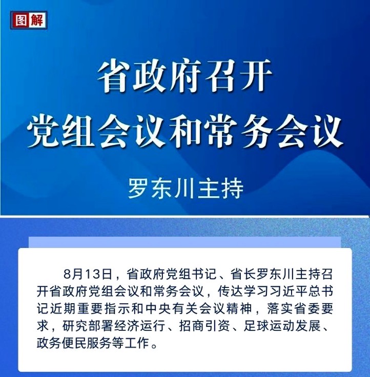 8月13日,省政府党组书记、省长罗东川主持召开省政府党组会议和常务会议,传达学习习近平总书记近期重要指示和中央有关会议精神,落实省委要求,研究部署经济运行、招商引资、足球运动发展、政务便民服务等工作。