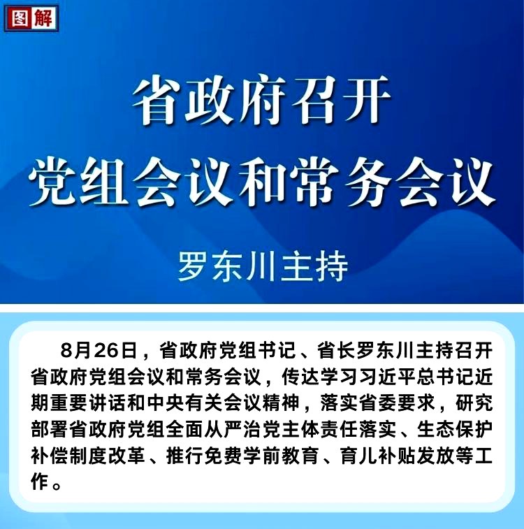 8月26日,省政府党组书记、省长罗东川主持召开省政府党组会议和常务会议,传达学习习近平总书记近期重要讲话和中央有关会议精神,落实省委要求,研究部署省政府党组全面从严治党主体责任落实、生态保护补偿制度改革、推行免费学前教育、育儿补贴发放等工作。