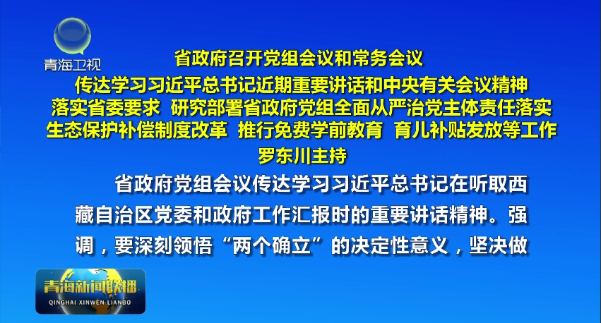 省政府党组会议传达学习习近平总书记在听取西藏自治区党委和政府工作汇报时的重要讲话精神。强调,要深刻领悟“两个确立”的决定性意义,坚决做到“两个维护”,全面贯彻新时代党的治藏方略,牢牢把握青海在全国发展大局中的战略定位,坚定不移扛牢守护“中华水塔”重大政治责任,坚定不移推进高质量发展,坚定不移保障和改善民生,坚定不移维护社会大局和谐稳定,奋力谱写中国式现代化青海篇章。