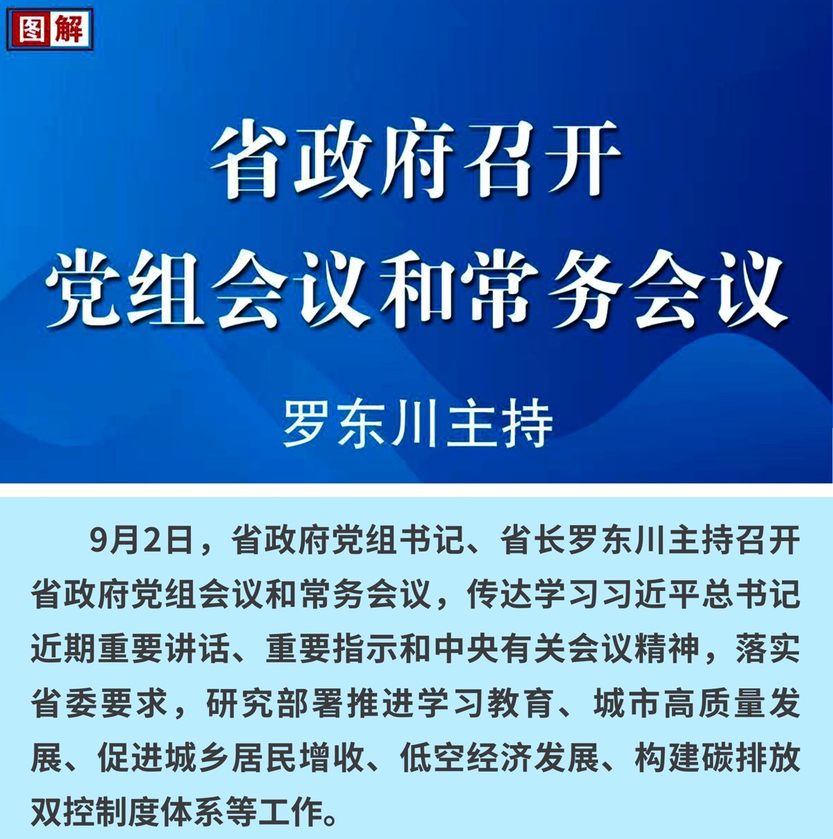 9月2日,省政府党组书记、省长罗东川主持召开省政府党组会议和常务会议,传达学习习近平总书记近期重要讲话、重要指示和中央有关会议精神,落实省委要求,研究部署推进学习教育、城市高质量发展、促进城乡居民增收、低空经济发展、构建碳排放双控制度体系等工作。