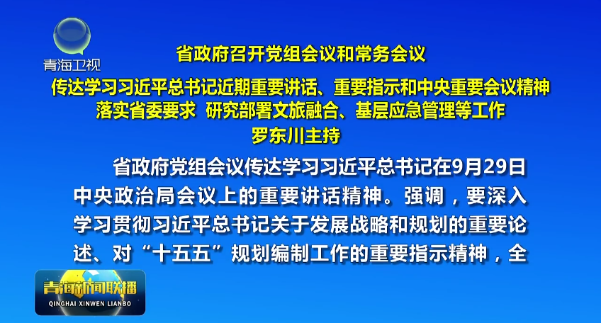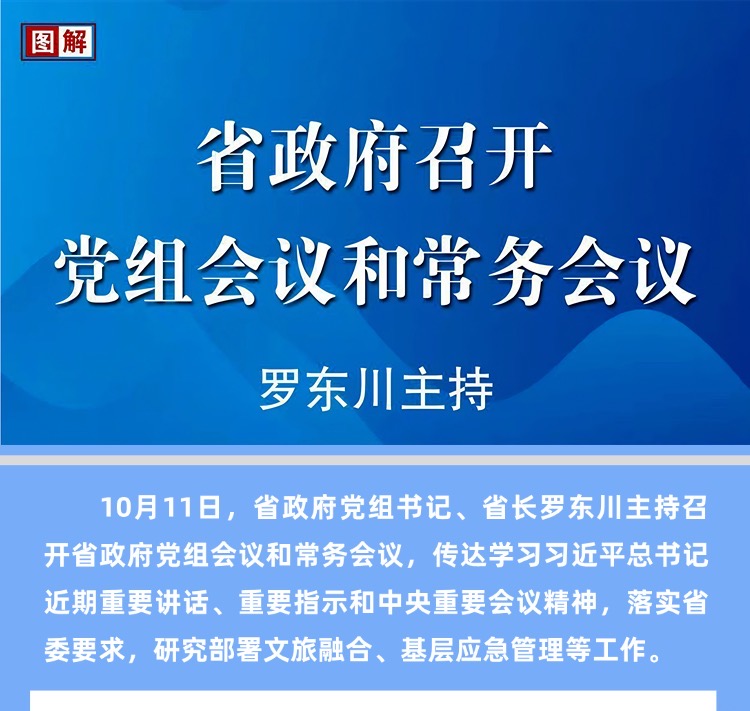 10月11日,省政府党组书记、省长罗东川主持召开省政府党组会议和常务会议,传达学习习近平总书记近期重要讲话、重要指示和中央重要会议精神,落实省委要求,研究部署文旅融合、基层应急管理等工作。