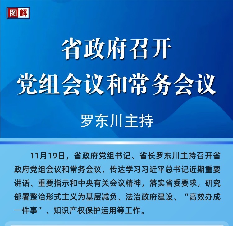 11月19日,省政府党组书记、省长罗东川主持召开省政府党组会议和常务会议,传达学习习近平总书记近期重要讲话、重要指示和中央有关会议精神,落实省委要求,研究部署整治形式主义为基层减负、法治政府建设、“高效办成一件事”、知识产权保护运用等工作。