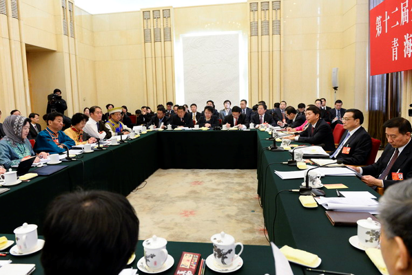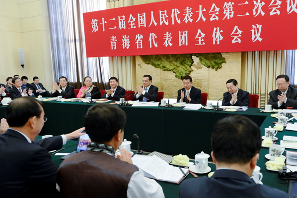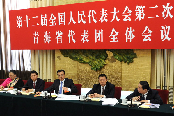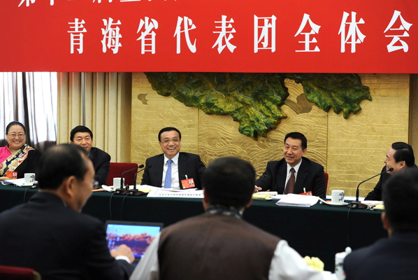 在听取代表们发言后,李克强说,青海地处西部高原,经济发展和生态保护要“双轮驱动”。要更加重视抓好三江源等地区生态环境保护和建设,大力发展循环经济,努力在生态文明建设上“先行快跑”。要合理有序勘探和开发资源。抓住机遇,扩大对内对外开放,加快发展特色优势产业,加强交通等重大基础设施建设,与周边地区互联互通,有效承接产业转移,促进形成和发展内陆开放型经济。要增加投入,进一步支持青海打好扶贫开发攻坚战,大力支持改善农村贫困地区义务教育薄弱学校基本办学条件,在经济发展、生态改善中实现减贫脱贫,使各族群众在改革发展中得到实惠,让“大美青海”越来越美。