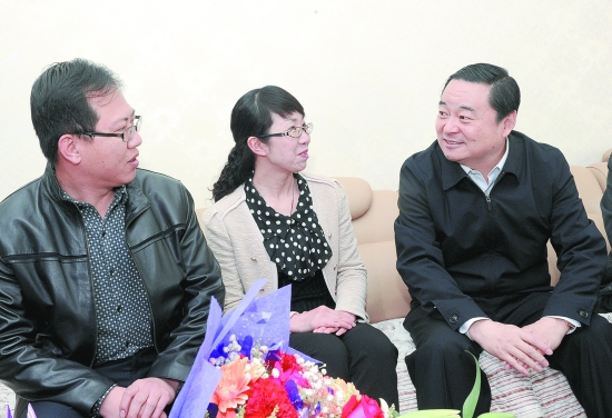 五一前夕,省委副书记、省长郝鹏专程来到青海省劳动模范、青藏铁路公司西宁客运段副队长黄丽敏和“全国五一劳动奖章”获得者、省电力科学研究院设备状态评价中心主任李玉海家中,给他们送上鲜花。郝鹏说,我代表省委省政府看望慰问你们,并通过你们向全省广大劳动模范、先进工作者、先进集体及各族劳动群众致以节日的问候。