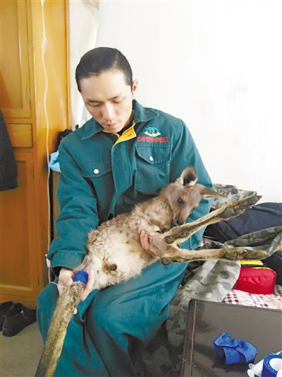 原来赵海龙怀里的这只三个月的小袋鼠生病了。“今天的点滴从早上九时一直打,我是看着它长大的,病了以后它不能站立,每次打针我都这样抱着它。”赵海龙说。