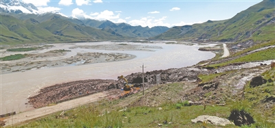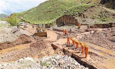 囊谦公路段工作人员正在抢修冲毁路段。洪玉杰 摄