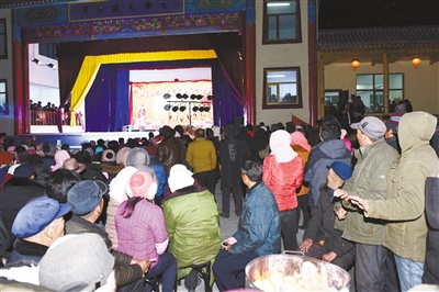 夜幕降临,村里的舞台前早早地就围满了人。他们或站在舞台前的广场上烤火祛除寒意,或坐在长廊的凳子上耐心等待。廊檐下,火红的红灯笼随风摇曳。