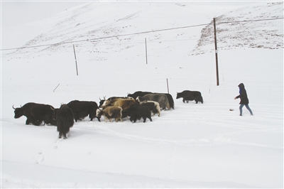 车辆向西南方向逐步纵深,积雪越来越厚。同车当过牧人的蒙古族记者土布旦告诉我们,只要雪还没有盖住“白乃草”,那么牦牛就可以舔食下面的牧草。
