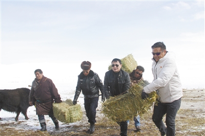 优云乡干部将青贮饲料搬运到受灾牧民牧场。姚斌祁瑛摄