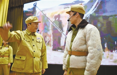 青海省海西蒙古族藏族自治州委党校高级教师白继红(前左)在青海西宁举行的“慕生忠开路精神”党课上扮演慕生忠将军(3月20日摄)。新华社记者张宏祥摄