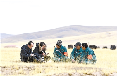 记者在曲麻莱草原采访生态管护员。黄灵燕摄