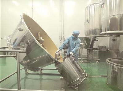 安儿宁颗粒是金诃藏药企业的核心产品,也是销售量最大的产品。走进金诃藏药安儿宁颗粒生产车间,提取工序中,工作人员将提取到的胶质物干燥,以获得药物。粉碎、制粒、总混,经过几道工序,膏状药物和蔗糖等辅料在最后的生产环节混合均匀。“安儿宁是小儿常用感冒药,添加辅料是为了让药品口味适口。”颗粒车间主任余勇指着窗内的生产线告诉记者,一批次生产的物料在2000公斤,一小时生产的物料在两百公斤左右。车间工人除了中午吃饭时间,从9时到17时,一直都在工作岗位上忙碌。“前道工序的生产速度会快一些,如果前道工序的生产能力不足,后道工序就得停下。”余勇说。