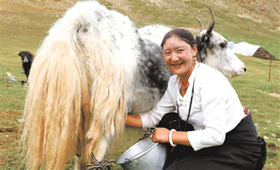 在青海省玉树藏族自治州治多县治渠乡同卡村,村民昂文西让的妻子布沙措江卓玛正在挤牛奶(9月12日摄)。新华社记者韩方方摄