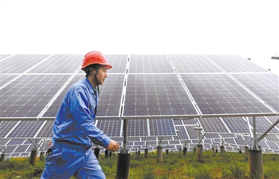 6月27日,国网青海海东供电公司建设部工作人员张永科在互助土族自治县村级光伏扶贫2号电站内的光伏电板前走过。新华社记者张宏祥摄