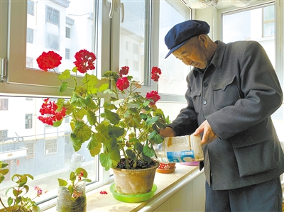 翻身村75岁的建档立卡贫困户吴作仓在家中浇花(4月2日摄)。新华社记者张大川摄