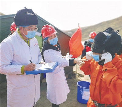 医护人员对进入施工现场作业的施工人员进行测温登记,做好疫情期间安全防范工作。