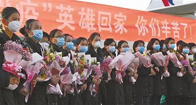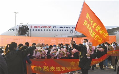 3月17日下午,青海支援湖北医疗护理队圆满完成医疗救治和护理任务,凯旋归来。祁国彪 黄灵燕摄